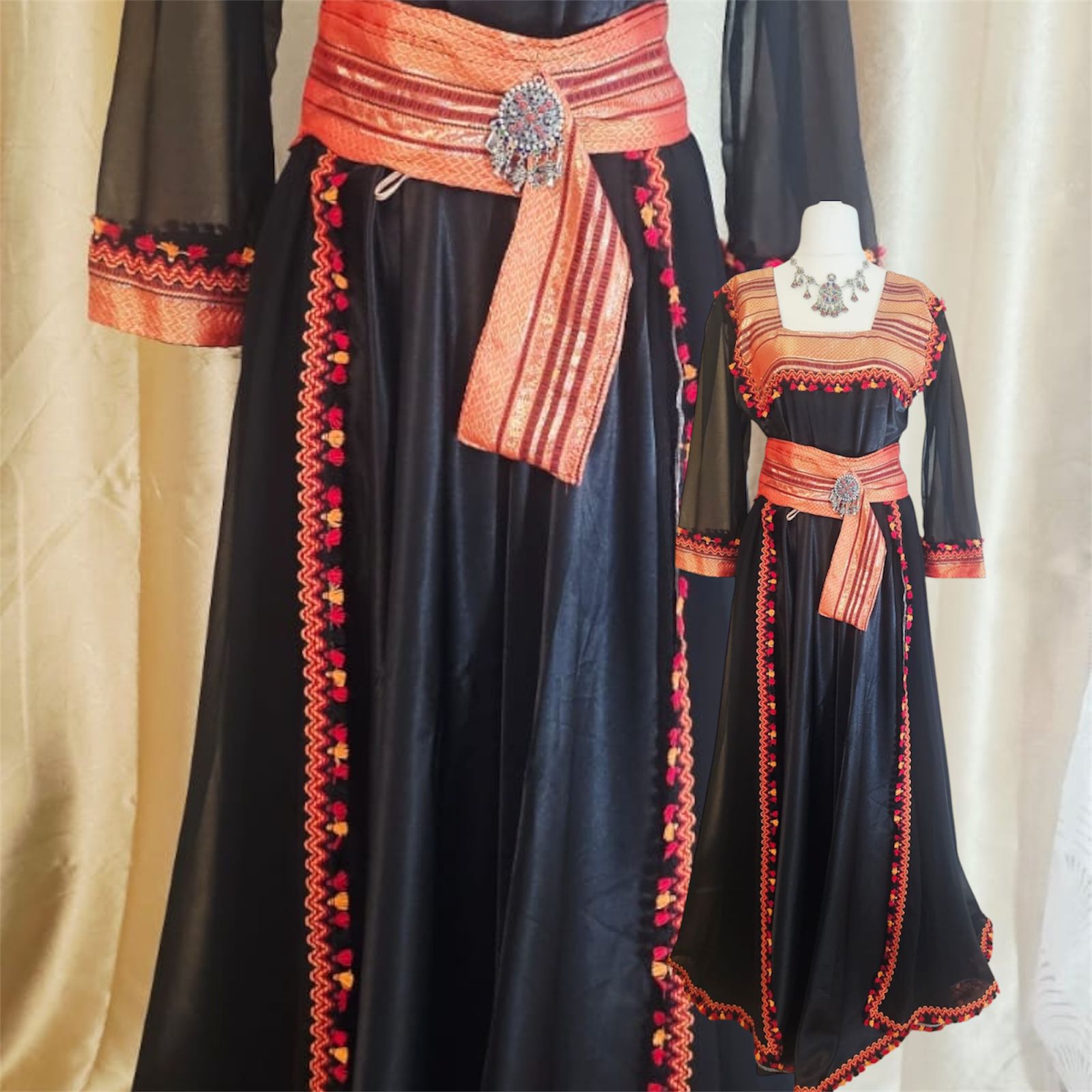 The Robe Noir Fota is a striking blend of tradition and elegance. Crafted in a flowing black fabric, it features rich embroidered detailing in warm tones along the neckline, sleeves, and front, complemented by a matching waist belt with an embellished buckle. A timeless piece designed for elevated occasions.