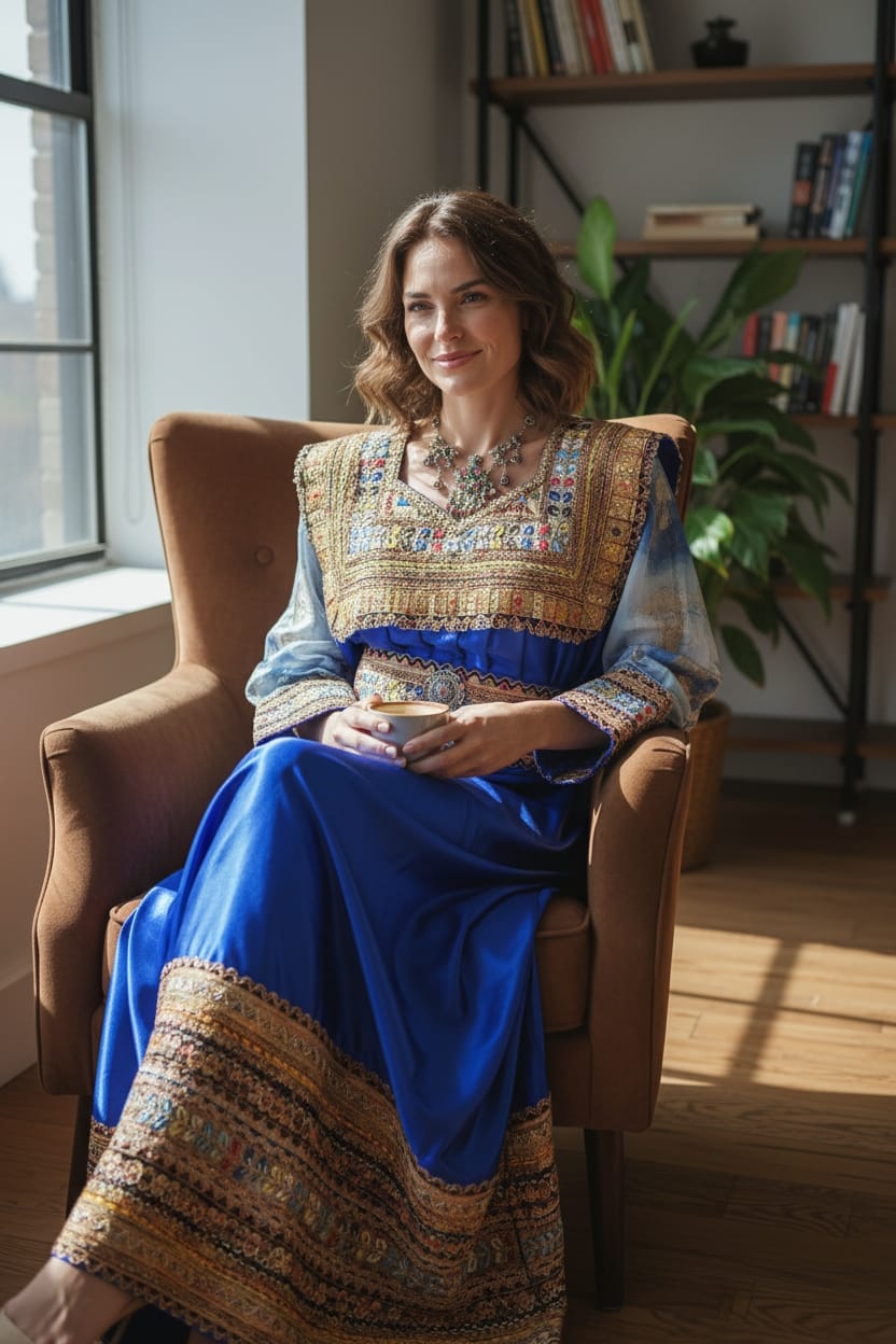 The Robe Nour is a timeless expression of elegance and craftsmanship. Designed in a rich blue fabric, it features intricate embroidery across the neckline, sleeves, and hem, creating a beautifully refined silhouette. Perfect for special occasions, this dress combines comfort with understated luxury.
