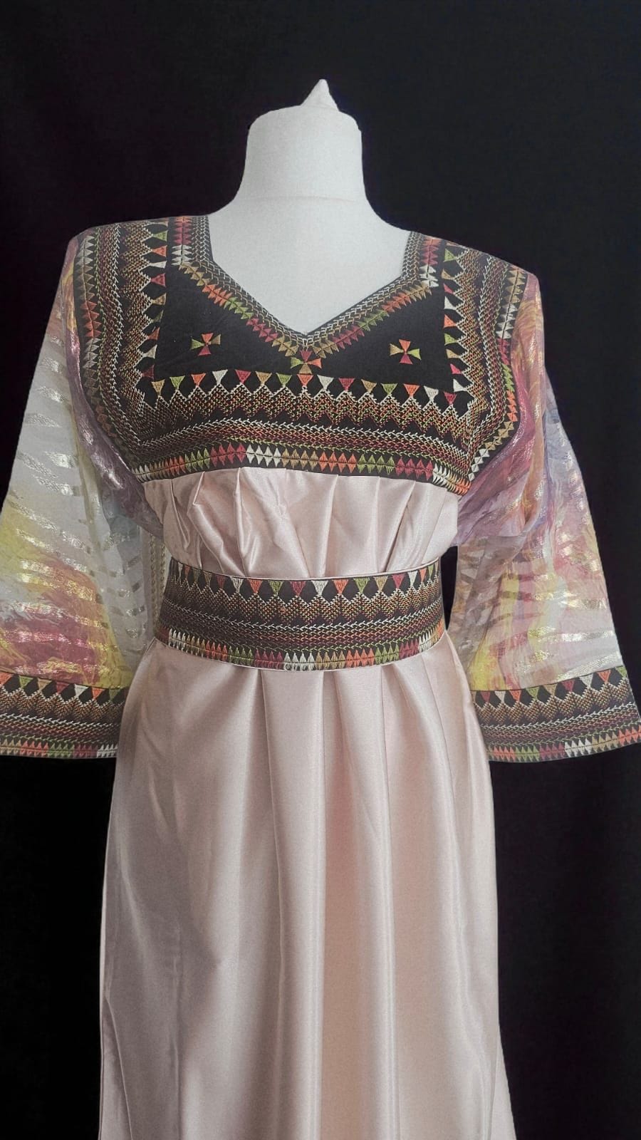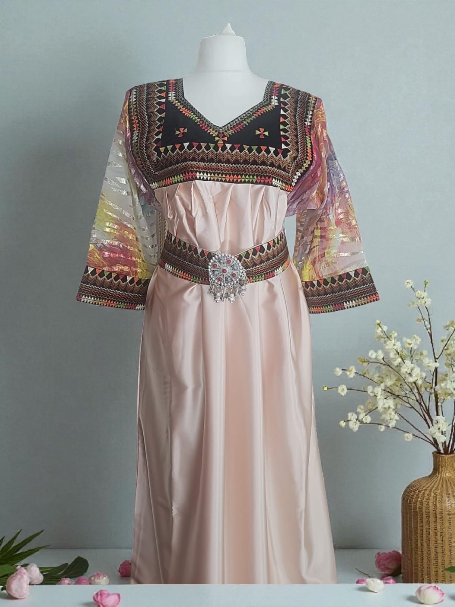 The Satin Broder dress blends soft luxury with artisanal detail. Crafted from smooth satin, it features intricate geometric embroidery across the bodice, waist, and sleeves, complemented by sheer textured sleeves for a graceful finish. A defined waist and flowing silhouette create an effortlessly elegant look, perfect for refined occasions.